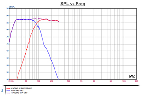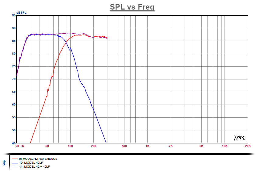 The Model 42’s coaxial drivers gradually lose energy around 65 Hz, while the 42LF’s bass enclosure begins to gain energy around 85Hz. Click image above to view SPL vs Frequency graph.